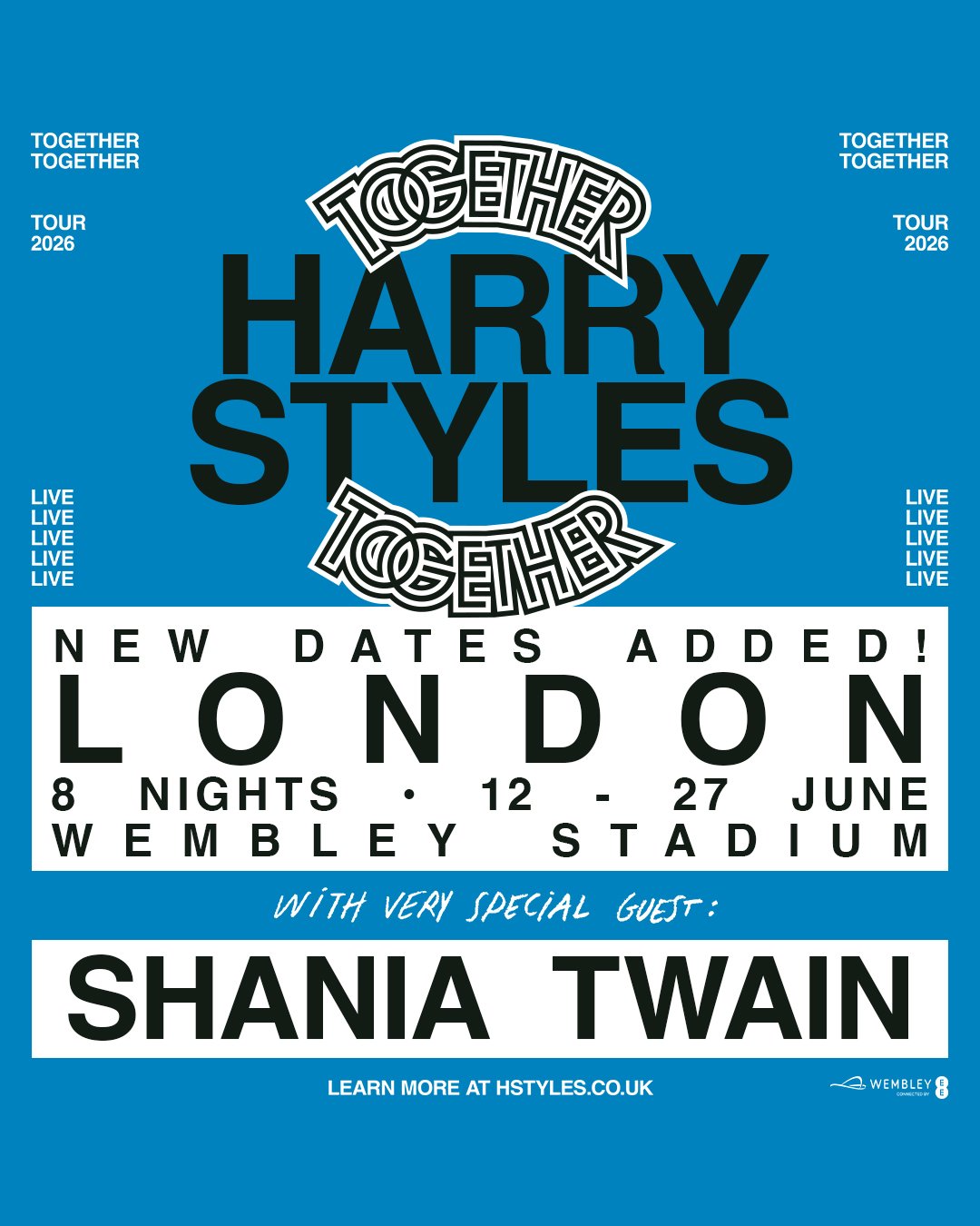 Harry Styles will be performing at the iconic and historic Wembley Stadium as part of his Together, Together Tour for 2026 across eight extraordinary nights of music in London between Friday, 12th June and Saturday, 4th July 2026. These concerts will also feature special guest and music icon Shania Twain.